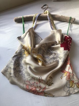 Bonito top de seda con un estampado floral vibrante. Su diseño ligero y fluido lo hace ideal para cualquier ocasión. - Tejido: 100% seda. - Estampado: Flores en tonos beige, rosa, rojo y gris. - Tirantes: Finos y decorados.