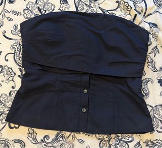 Top sin tirantes de color azul. - Diseño con detalle fruncido en la parte superior. - Cierre de botones en la parte frontal.