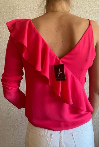 Camisa fucsia con un diseño asimétrico y detalles de volantes. - Escote en V pronunciado. - Un hombro descubierto con tirante fino. - Manga larga en un lado. - Volantes decorativos en cascada.