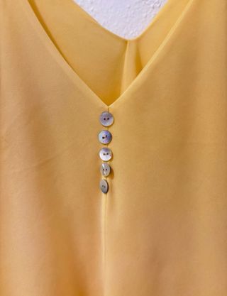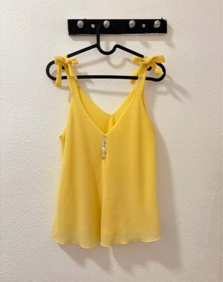 Blusa de tirantes en color amarillo, perfecta para un look fresco y veraniego. Los tirantes se anudan en los hombros, añadiendo un detalle coqueto. - Tirantes con lazo. - Detalle de botones frontales.