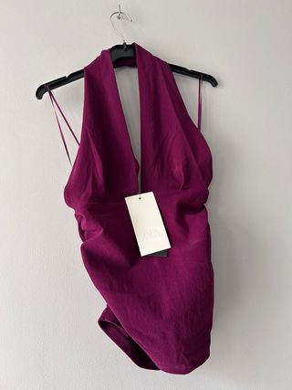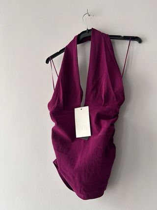 Top de Zara con un diseño halter y un vibrante color morado. Perfecto para un look elegante. - Diseño cruzado en el escote. - Tirantes finos ajustables. - Tejido con textura.