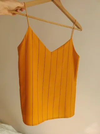 Top de tirantes de Bimani en talla S. Es una prenda ligera y versátil. Tejido que no se arruga Tela en color mostaza con rayas negras Top recto Largo medio Escote pico Tirantes finos Diseñado y confeccionado en España