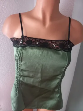 Top lencero, de raso verde, con puntilla negra y adornos brillantes de flores. Tirantes finos. Diseño con pinzas verticales Marca Accesorize. Mide 52 cm de largo y 46 cm de sisa a sisa, talla L. Un pequeño enganchón. Ver fotos
