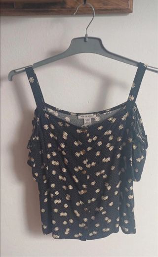 Top corto de Zara con estampado floral. - Tirantes finos ajustables. - Cuerpo fruncido con elástico. - Bajo con volante.