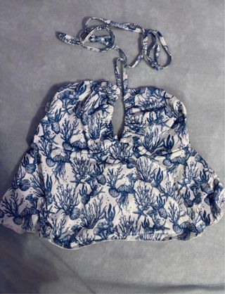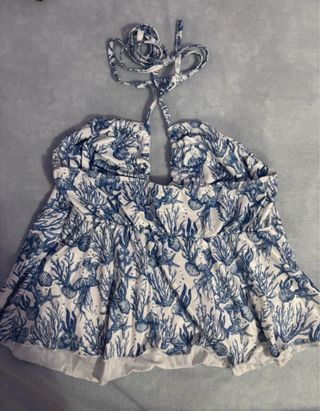 Top veraniego con un bonito estampado inspirado en el mar. - Diseño ajustable. - Estampado de corales, estrellas de mar y medusas en azul y blanco. - Tirantes para atar al cuello y espalda.