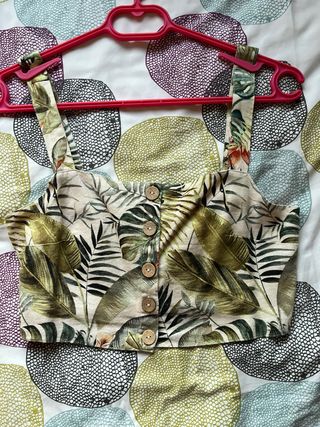 Top corto con un bonito estampado de hojas tropicales y flores. Tiene botones de madera en la parte delantera y tirantes. - Diseño de hojas y flores. - Cierre de botones de madera. - Tirantes.