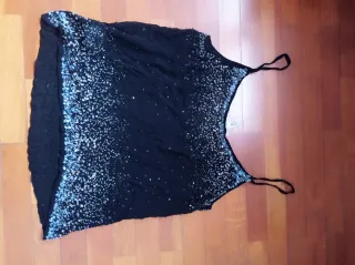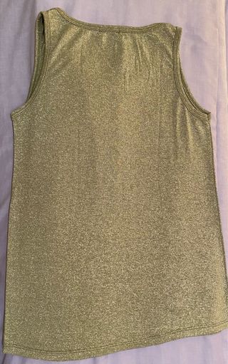 Camiseta de tirantes con un tejido brillante, ideal para ocasiones especiales o para añadir un toque festivo a tu look. Es nueva y se encuentra en perfecto estado. - Diseño de tirantes. - Acabado metalizado.