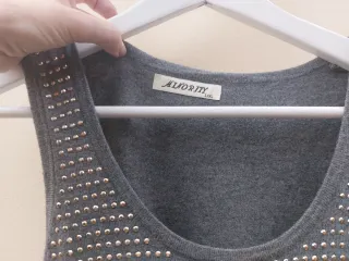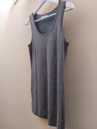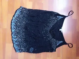 Camiseta sin mangas de color negro, adornada con pedrería brillante. - Diseño con cuello redondo. - Tejido elástico acanalado. talla S Largo 60 cm, hombros 31 cm ,ancho 37 cm