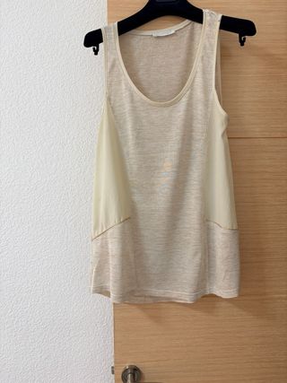 Camiseta de tirantes de algodón de la marca Promod. - Diseño con paneles laterales de tela semitransparente. - Acabado con costuras decorativas en la parte inferior. - Tiene una manchita en el tirante izquierdo