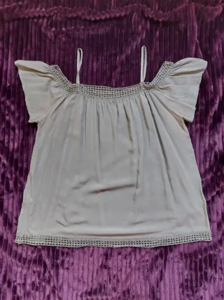 Blusa de color caqui o verde, ideal para vestir elegante en primavera. El modelo es ancho y tiene un pequeño encaje en los bordes. Manga corta y con tirantes. La talla no aparece, pero corresponde a una M o L. #Natural #Tendencia #Primavera #Verano #Básico