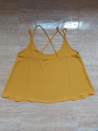 Blusa de color amarillo mostaza, ideal para vestir elegante o casual en verano. Tejido ancho y sin etiquetas. Con tirantes cruzados. La talla no aparece, pero corresponde a una M. #Verano #Tendencia #Joven #Primavera #Básico