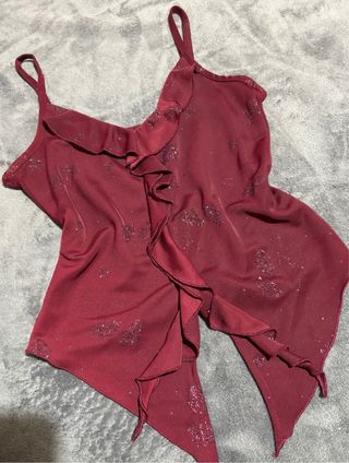 Top con tirantes finos y detalle de volantes en cascada. - Tejido con estampado de brillos. - Diseño asimétrico en el bajo. - Tirantes ajustables.