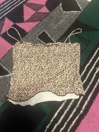 De tela vaporosa. Tirantes finos no ajustables. Queda más o menos a la altura del ombligo. Color verde y amarillo clarito. Me la he puesto 3 o 4 veces.