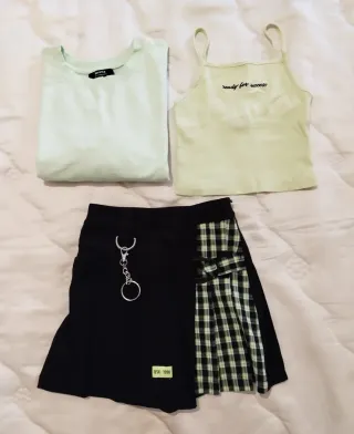 Conjunto de tres prendas de Bershka, muy poco uso. Super cómodo y bonito, sirve para mayor o niña 13,14,15 años. 🤩🤩🎁 - Camiseta de manga corta en color verde menta. Corta, anchita. - Top de tirantes con texto bordado. Verde menta. - Falda pantalón negra con detalle de cuadros negros y verdes. Cintura con elástico. - Sirve talla XS, S. Lleva elástico.