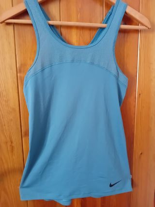 Preciosa camiseta de tirantes para running de la marca Nike. Es de color verde azulado y tiene zonas de rejilla en los tirantes y la espalda para una mejor transpiración. Es súper ligera. En muy buen estado. Talla S.