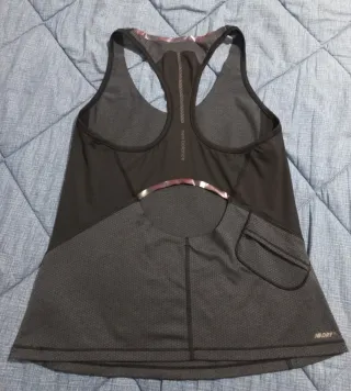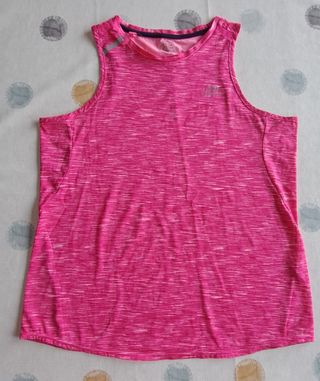 Camiseta deportiva New Balance para mujer, ideal para running. Apenas ha sido usada. - Diseño con paneles laterales en contraste. - Tejido técnico transpirable. - Pequeño bolsillo en la parte de atrás. - Tirantes tipo racerback para mayor libertad de movimiento.