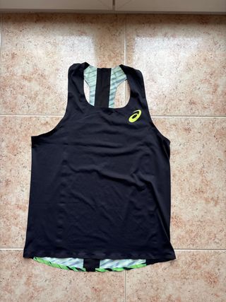 Camiseta de tirantes ASICS para running. - Diseño en color negro con detalles en verde. - Tejido ligero y transpirable. en la etiqueta pone L pero talla muy poco