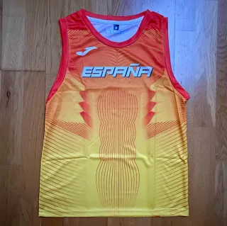 Camiseta de tirantes para running o atletismo con diseño vibrante. - Diseño con degradado naranja y detalles lineales. - Logo de Joma en blanco en el pecho. - Inscripción ESPAÑA en grande en el frontal. - Talla M y L.