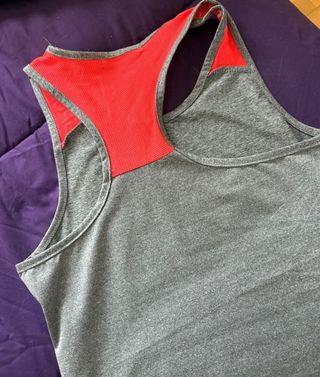 Camiseta deportiva de tirantes en color gris. Presenta detalles en color rojo en los tirantes con la palabra SPORT. Como nueva Camiseta Sport – Talla 34-36 🏃♀️ 👕 Marca / Estilo: Sport 🎨 Color: Gris con detalles en naranja fluor 📏 Talla: 34-36 ✨ Uso: Perfecta para deporte y actividades al aire libre 📝 Descripción: Camiseta deportiva en gris con detalles llamativos en naranja fluor. Cómoda, ligera y funcional, ideal para entrenamientos, running o cualquier actividad física. Diseño moderno y práctico que no puede faltar en tu ropa deportiva. - Diseño de tirantes. - Tejido cómodo para la actividad física.