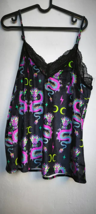 Camiseta de tirantes con un llamativo estampado de dragones y elementos celestes. - Diseño con dragones en tonos fucsia, azul y verde. - Detalle de encaje negro en el escote. - Tejido suave y ligero.