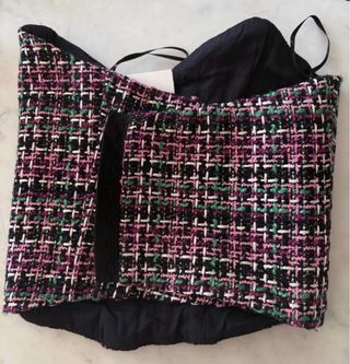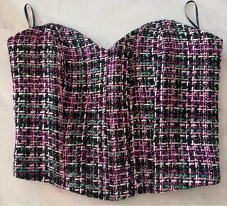 Precioso top de Zara con un diseño tweed muy chic. - Tejido texturizado con hilos morados, negros, blancos y verdes. - Corte tipo corsé. - Tirantes finos negros.