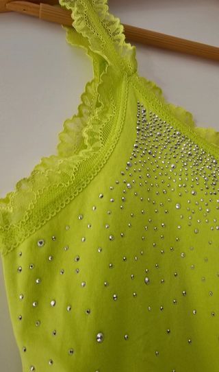 Top de lentejuelas en color verde, de la marca Encuentro. Es un modelo bastante anchito. - Diseño con tirantes. - Escote en pico.