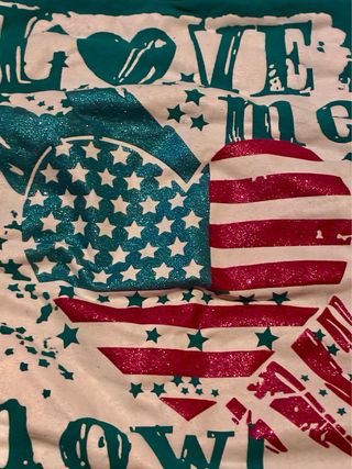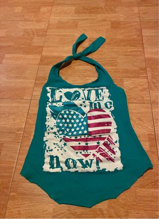 Top estilo halter en color verde con un llamativo estampado. - Diseño de corazón con la bandera de Estados Unidos. - Detalle de texto LOVE me now!. - Tirantes para atar en el cuello.