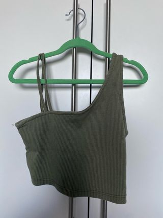 Top deportivo en color verde botella con tejido canalé elástico que se adapta al cuerpo y estiliza la figura Tiene tirantes anchos y escote redondeado, súper cómodo tanto para hacer deporte como para llevar en looks casuales (con leggings, jeans o falda). El tejido es grueso y de buena calidad, no transparenta y sujeta bien. Está en muy buen estado, apenas usado. Sin manchas ni desperfectos. Ideal para gym, yoga, pilates o para un outfit comfy diario
