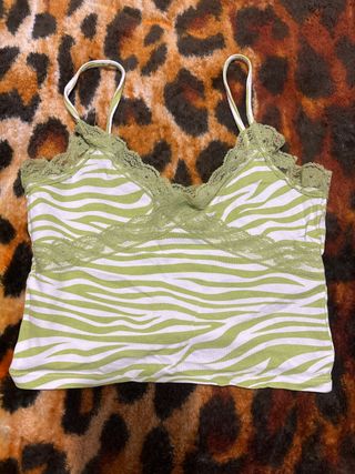 Top con estampado de cebra en tonos verde y blanco. Presenta un delicado detalle de encaje en el escote y los tirantes. - Diseño de cebra. - Ribete de encaje verde.