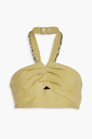 Top de Sandro en color verde, talla 1. - Diseño con escote halter. - Detalle de fruncido en el pecho. - Adorno de pedrería en los tirantes. - Abertura triangular en la parte frontal.