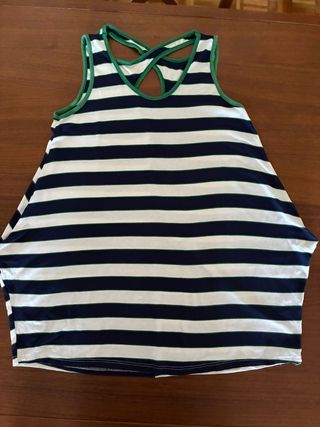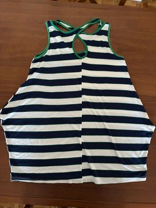 Camiseta de tirantes con un diseño de rayas horizontales en azul marino y blanco. El cuello y los tirantes cruzados en la espalda están ribeteados en verde. Diseño ensanchado para dar sensación de fluidez al look.
