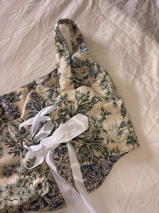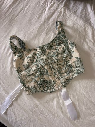 Corsé con un bonito estampado inspirado en el toile de Jouy. Es una prenda única con un diseño clásico y elegante. - Estampado detallado en verde sobre fondo beige. - Reversible azul y verde - Tirantes finos. - Lazos blancos en la parte inferior.