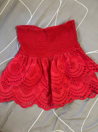 Este top es perfecto para un look veraniego y fresco. Su diseño con bordados le da un toque especial. - Tejido elástico en la parte superior. - Falda con detalle de bordados. - Diseño sin tirantes.