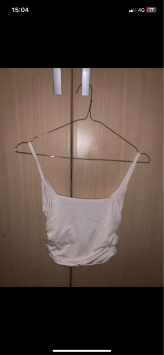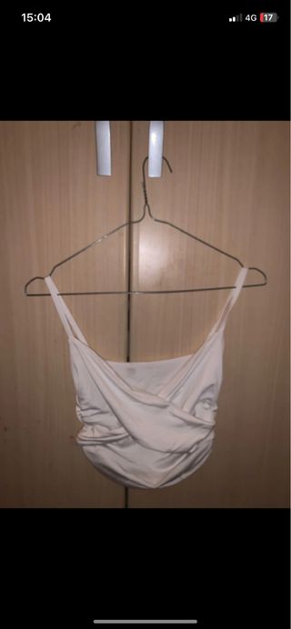 Crop top de tirantes de polipiel marrón camel, la parte de atrás es de algodón. Es elástico, tiene un punto suelto pero apenas se nota y tampoco se descose (ya lo compré así) el resto está en perfecto estado, poco uso. Talla S, de Stradivarius