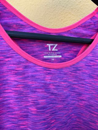 Camiseta deportiva sin mangas con un diseño vibrante. - Tejido jaspeado en tonos morado y rosa. - Ribete de contraste en cuello y sisas. - Pequeño logo de la marca en la parte inferior. Pocas veces usada Creo que es para 14 años aunque yo que tengo talla L y soy adulta me queda bien