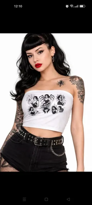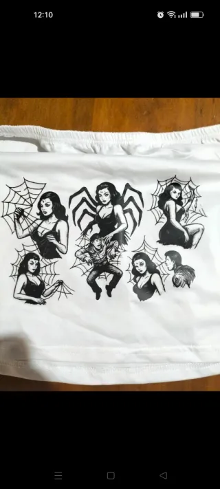 Top blanco con estampado de estilo pin-up y arañas. Es un top sin tirantes, ideal para un look atrevido. - Diseño con múltiples figuras femeninas y telarañas. - Tejido cómodo y elástico.