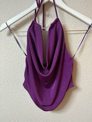 Top estilo halter de Bershka en un vibrante color morado. Su diseño drapeado en el escote le da un toque elegante y moderno. - Diseño halter con tirantes finos. - Escote pronunciado con drapeado. - Tejido con brillo sutil. -Forma de pico al final -Nudo al cuello que puedes ajustar a tu gusto Solo tiene un par de puestas