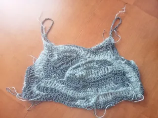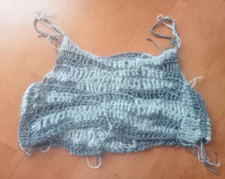 Top de lana tejido a mano, con un diseño abierto y tirantes. - Material: Lana. - Color: Gris y blanco.