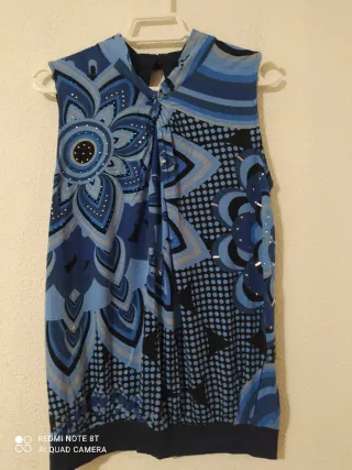 Blusa de tirantes con un estampado vibrante y llamativo. - Diseño con motivos florales y geométricos. - Detalles brillantes integrados en el estampado. - Cuello redondo con abertura en la espalda.