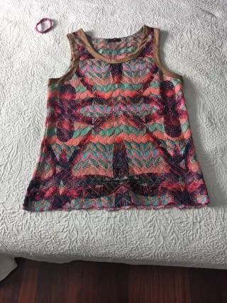 Camiseta de tirantes con un llamativo estampado de cebra. - Diseño con detalles en morado y verde. - Corte favorecedor. Camiseta con estampado de cebra. Usada y lavada una única vez. Es bastante larga.