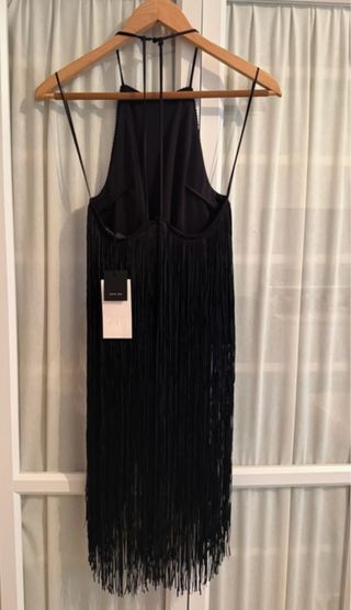 Top negro de flecos largos. - escote halter. - Tirantes finos.