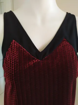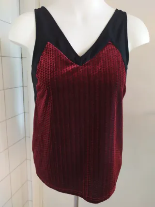 Top de tirantes de terciopelo dévoré granate sobre negro T. S Smash! Barcelona - Tejido principal de terciopelo con textura (tejido poliéster) - Paneles laterales y escote en contraste con forma de corazón - Corte favorecedor con escote pico Medidas: ancho: 42cms, hombro: 25cms, largo: 56cms, bajo: 50cms, bocamanga: 18,5cms. Casi sin uso, impecable y en perfecto estado, ver fotos. #smash #smashbarcelona #topterciopelogranate