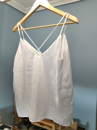 Preciosa camiseta de tirantes en color blanco. Es una prenda delicada y elegante, perfecta para cualquier ocasión. - Tirantes cruzados en la espalda. - Escote en la espalda. - Corte amplio y favorecedor.