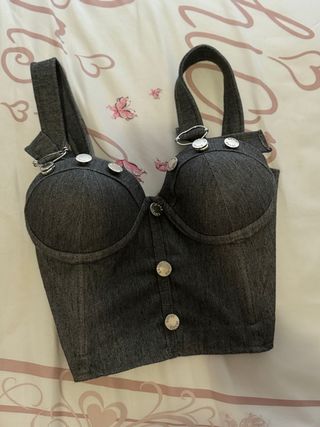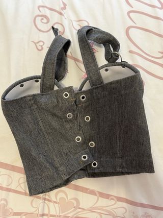 Este top colombiano es una prenda única con un diseño moderno. - Diseño tipo corsé. - Tirantes ajustables. - Detalle de botones frontales. - Adornos metálicos. - Tejido tipo denim.