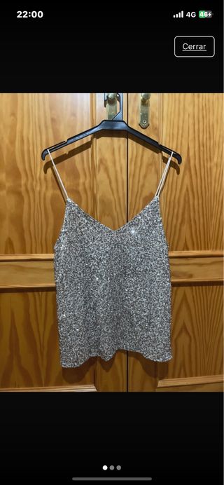 Camiseta plateada con lentejuelas brillantes. - Diseño con tirantes finos. - Escote en pico.