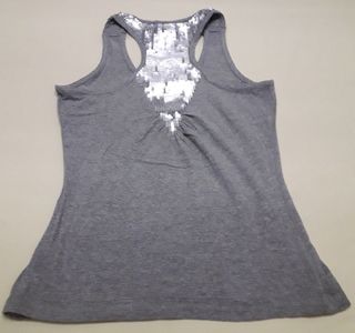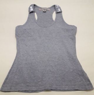 Preciosa camiseta de tirantes en color gris. Tiene unos detalles de lentejuelas plateadas en la espalda que le dan un toque elegante. - Tiene un corte entallado que se adapta a la figura. - Ideal para usar en verano o en ocasiones especiales.