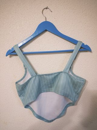 camiseta azul con tirantes ajustables. Se ajusta al pecho y tiene cierta caída. Talla S, tienda Stradivarius