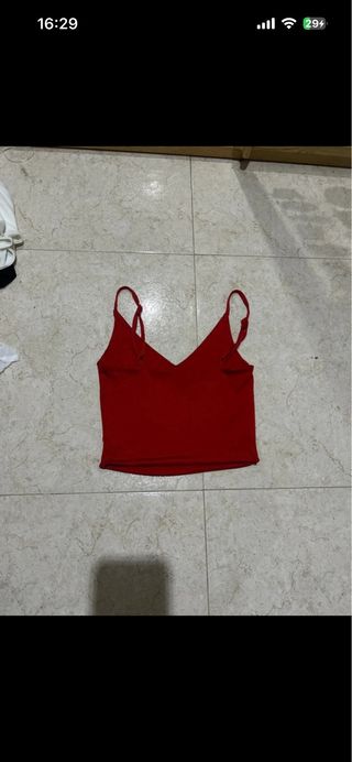 Top de tirantes de la marca Pull and Bear. Es de color rojo, blanco y azul.
