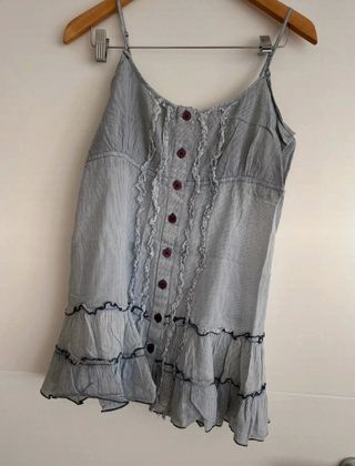 Top o camiseta de tirantes muy finos y regulable.Tipo gasa con dibujo pero con forro ,así que no transparenta.Puesto en 2 ocasiones.Con caída,no marca nada.Muy buen estado.Dale un toque especial a tu vestuario