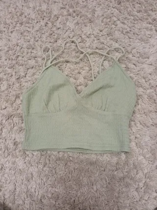 Top corto de tejido texturizado en color verde. Presenta un diseño con escote en pico y tirantes finos que se cruzan en la espalda. - Tejido texturizado. - Tirantes finos. - Diseño cruzado en la espalda.